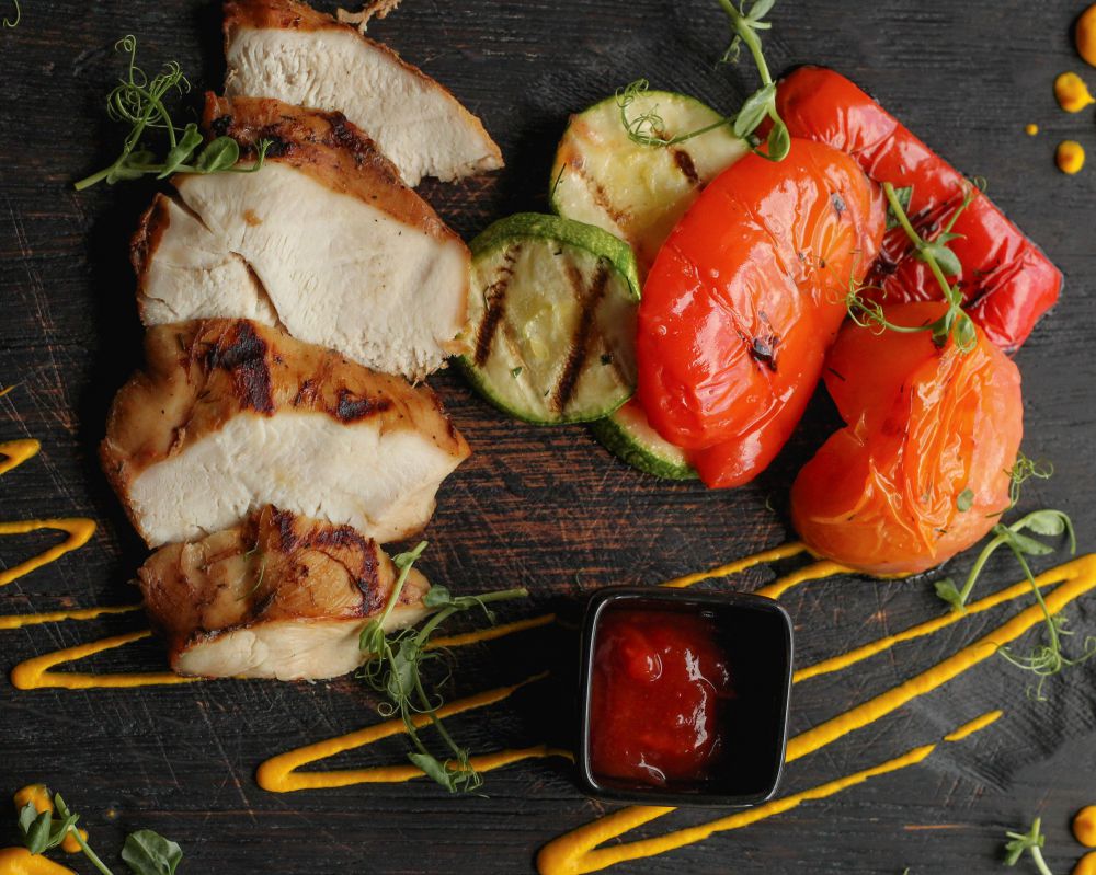 Нежная куриная грудка су-вид с соусом песто и овощами гриль