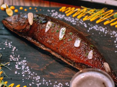 Маринованная в темном пиве с овощами и запеченная под медово-горчичным соусом, подается с тушеной капустой, горчицей и хреном.